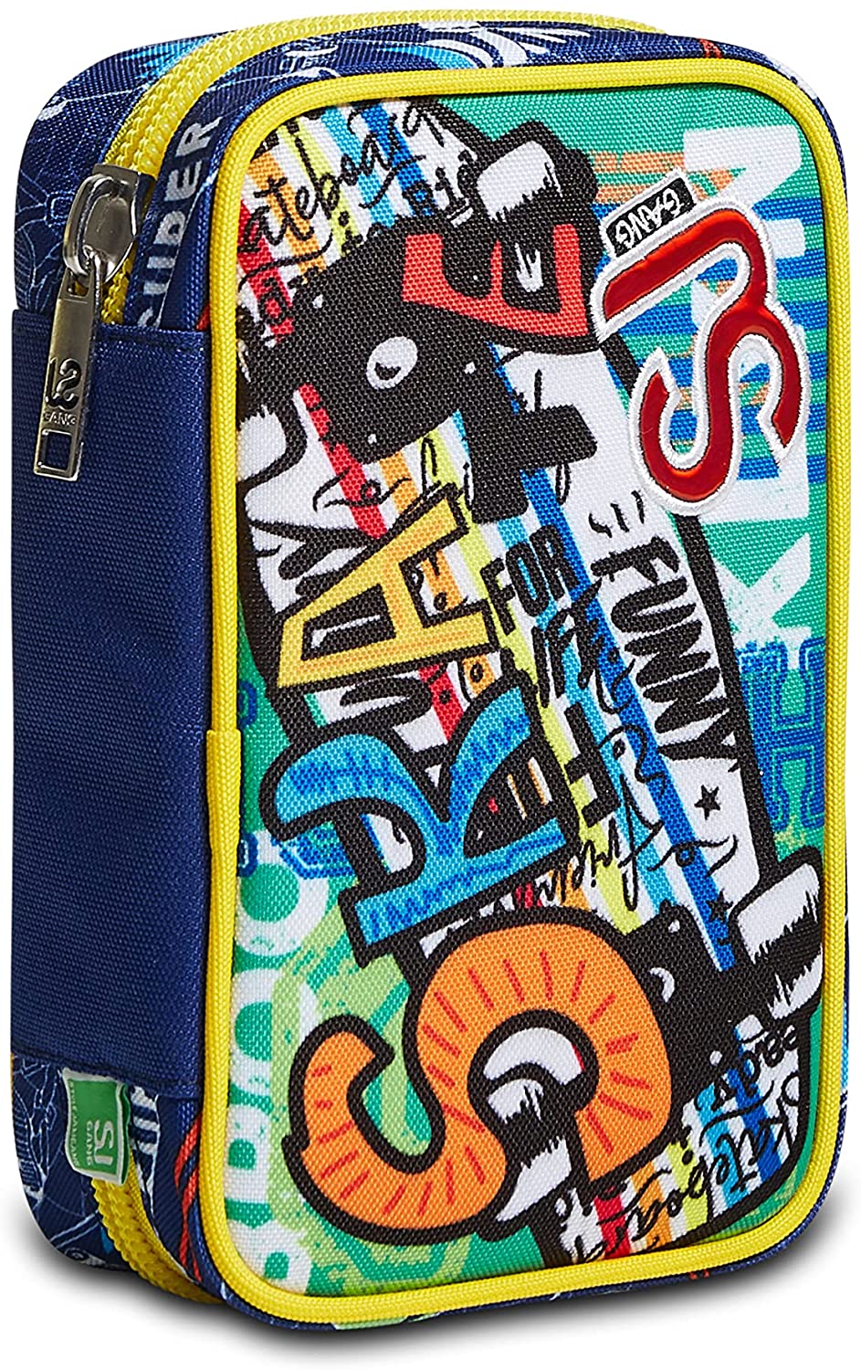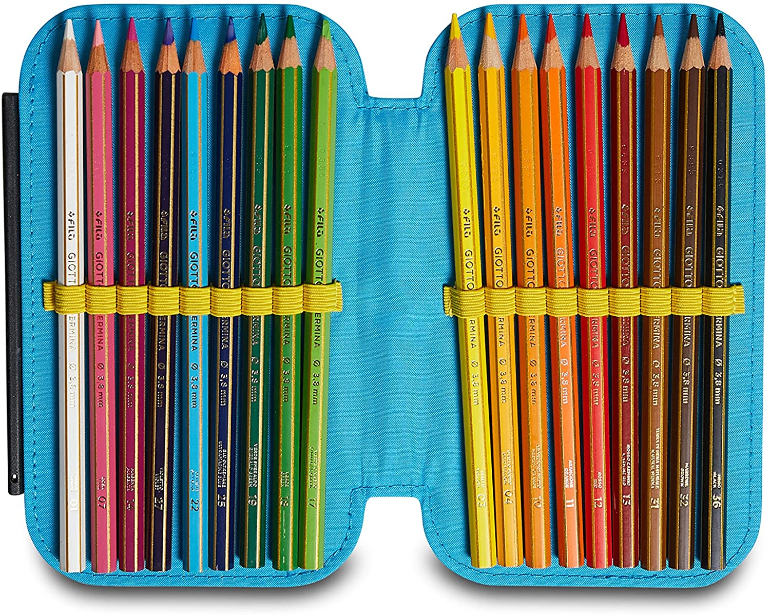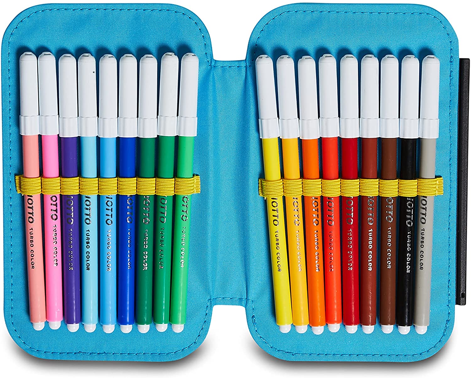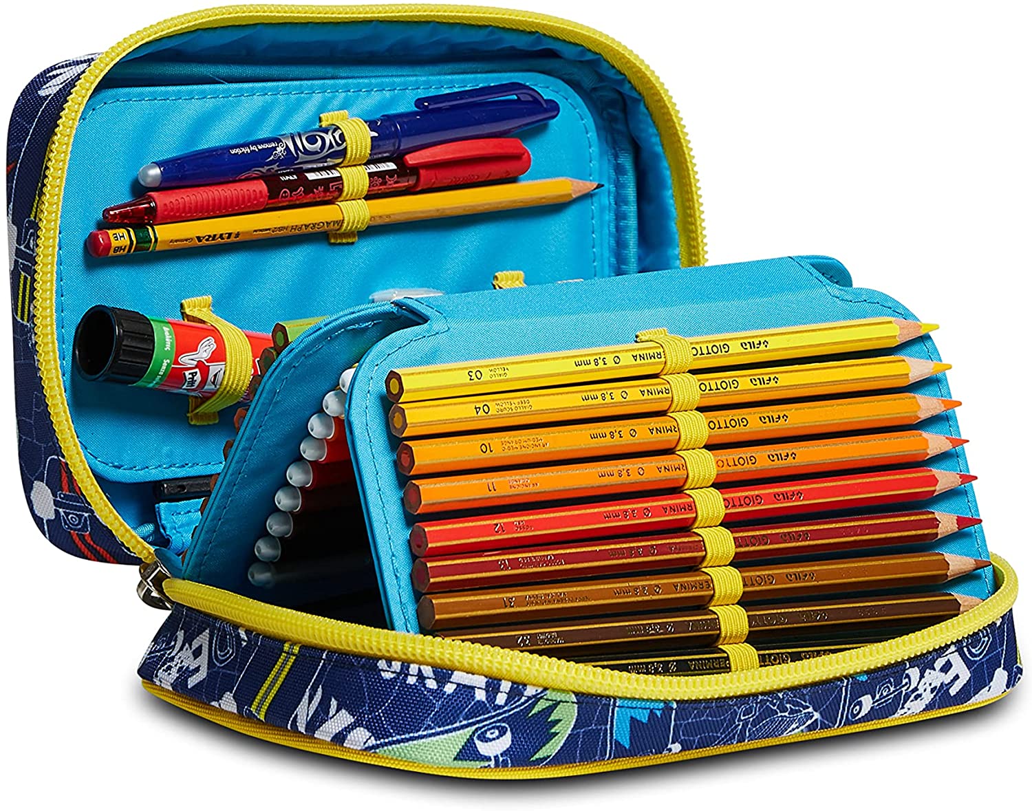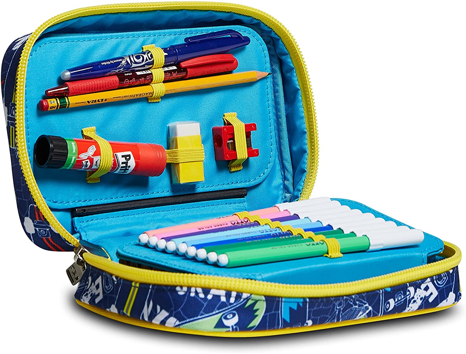 • TASCHE: Scomparto singolo.. ALTRE CARATTERISTICHE': CONTENUTO: 1 penna cancellabile blu, 1 penna rossa, 18 pastelli a colori, 18 pennarelli, 1 colla stick, 1 matita, 1 gomma, 1 temperino, 1 righello, 1 forbice. Nuovo astuccio con apertura singola e plance amovibili con elastici per la cancelleria.