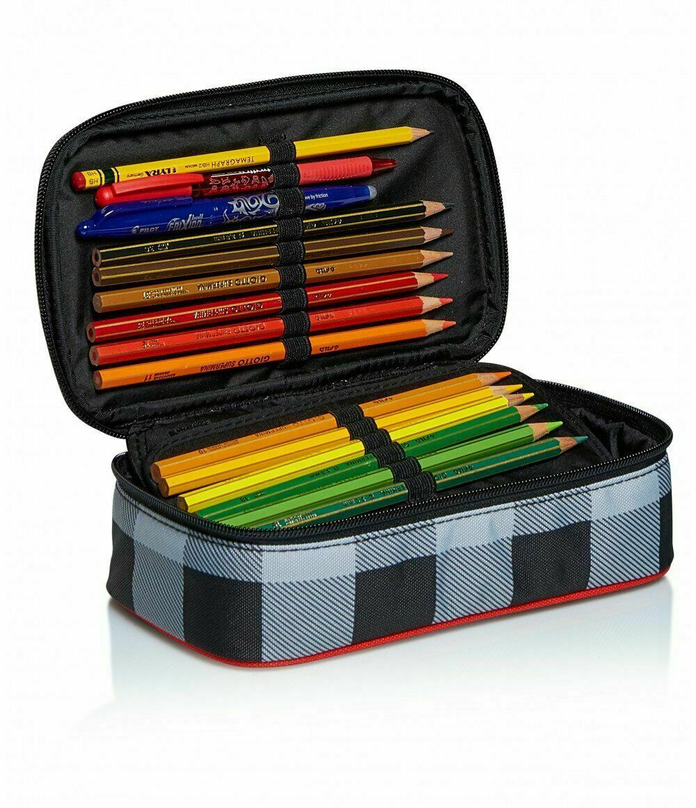 L’astuccio Quick Case Seven è il massimo con il logo in vernice glitter con ricamo. Ha un contenuto di primissima qualità come la penna cancellabile Frixion, la penna a sfera Tratto1Uno Grip, i 18 pennarelli Giotto Turbocolor, i 18 pastelli a colori Giotto Supermina, la colla Pritt e tutto il resto che ti serve per la scuola. Ha grafiche coloratissime e coordinate agli zaini e ai trolley. Scegli tu l’abbinamento che ti si addice.