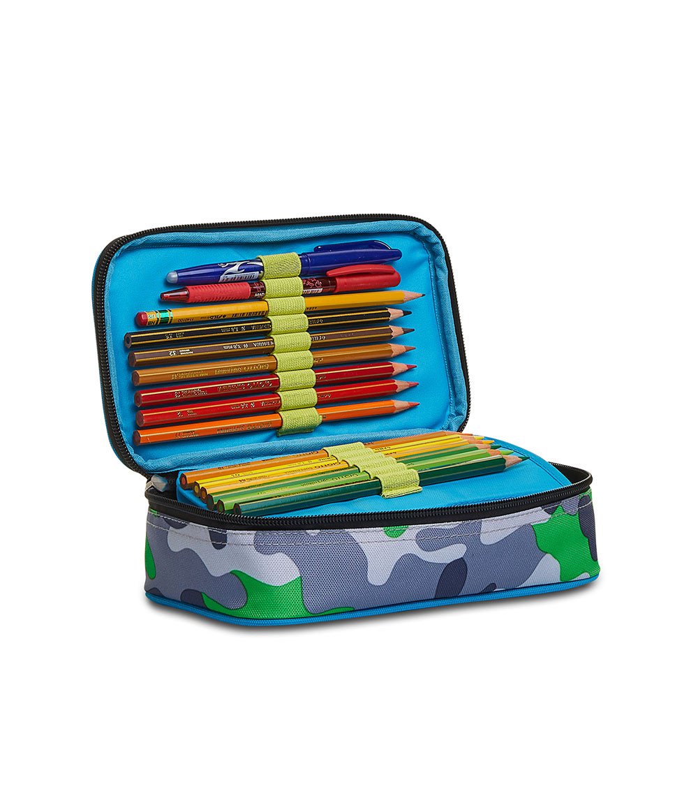 Ciao! Sono l’astuccio Quick Case SJ Gang con FLIP SYSTEM: divertiti a cambiarmi le grafiche ogni volta che vuoi! Sono dotato di comodi elastici porta penne su 3 lati e di un pratico blister. Al mio interno sono completo di tutto il materiale necessario per fare al meglio i tuoi lavori di scuola: 1 penna a sfera cancellabile PILOT FRIXION con inchiostro di colore blu, 1 penna a sfera FILA TRATTO 1UNO GRIP con inchiostro di colre rosso, 18 pastelli a colori GIOTTO SUPERMINA, 18 pennarelli GIOTTO TURBO COLOR, 1 colla stick PRITT, 1 matita grafite LYRA TEMAGRAPH, 1 gomma, 1 temperino, 1 righello trasparente, 1 goniometro trasparente, 1 forbice. Le mie grafiche sono coloratissime. Abbinami a uno zaino o a un trolley SJ Gang.