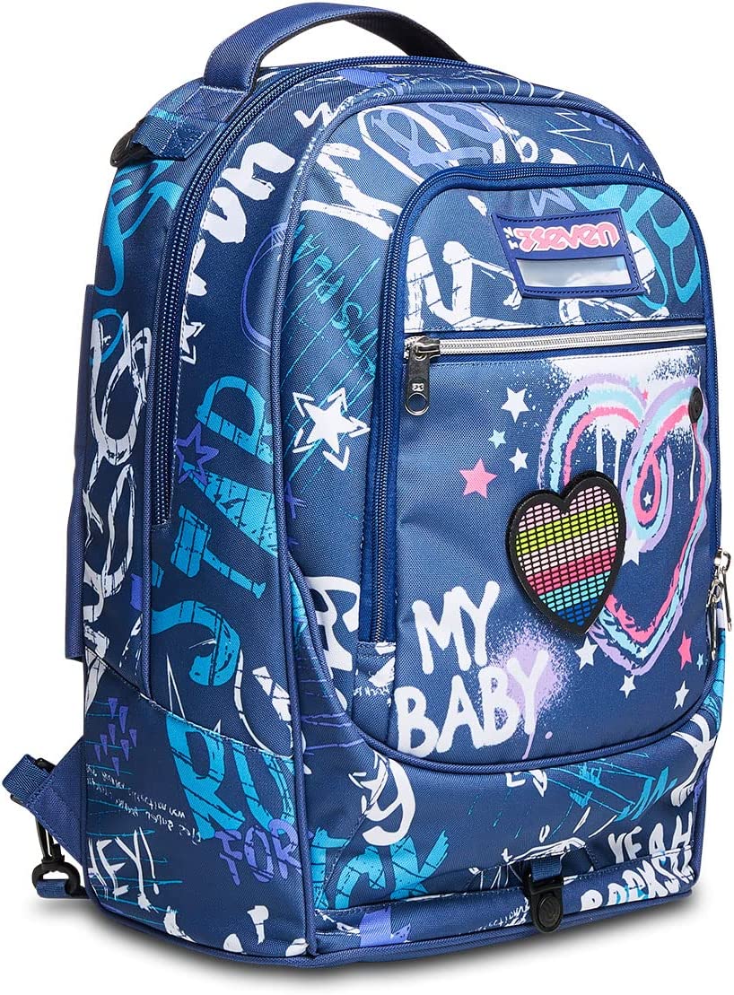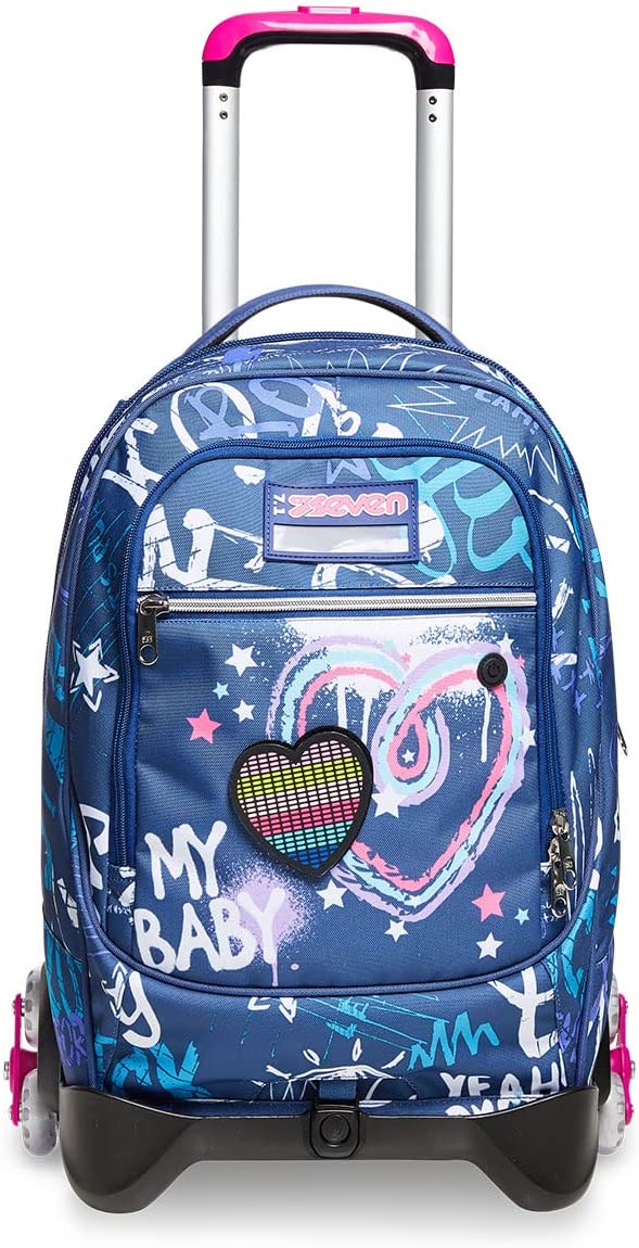Il Trolley Seven Jack-3WD è dotato di un fantastico cuore led che si illumina a tempo di musica! Lo attivi col pulsante ed è ricaricabile tramite USB. Con un sistema a 3 ruote che agevola la salita dei gradini e personalizzato con dettagli curati nei minimi particolari, unisce stile e versatilità . In poche semplici mosse, infatti, da trolley diventa zaino e viceversa. Il carrello ha fondo rinforzato e protezioni angolari per dare stabilità al trolley e protezione al contenuto. Lo sganci e hai uno zaino lavabile, maxi capiente, dotato di tasca frontale e comodo da indossare grazie a schienale e spallacci imbottiti. Spallacci che, se lo usi come trolley, possono essere a scomparsa o, grazie al CROSSOVER SYSTEM, possono sollevarsi automaticamente tirando su la doppia barra telescopica. In questo modo i nastri non strisciano a terra! La doppia barra telescopica è resistente e ha due regolazioni in altezza.