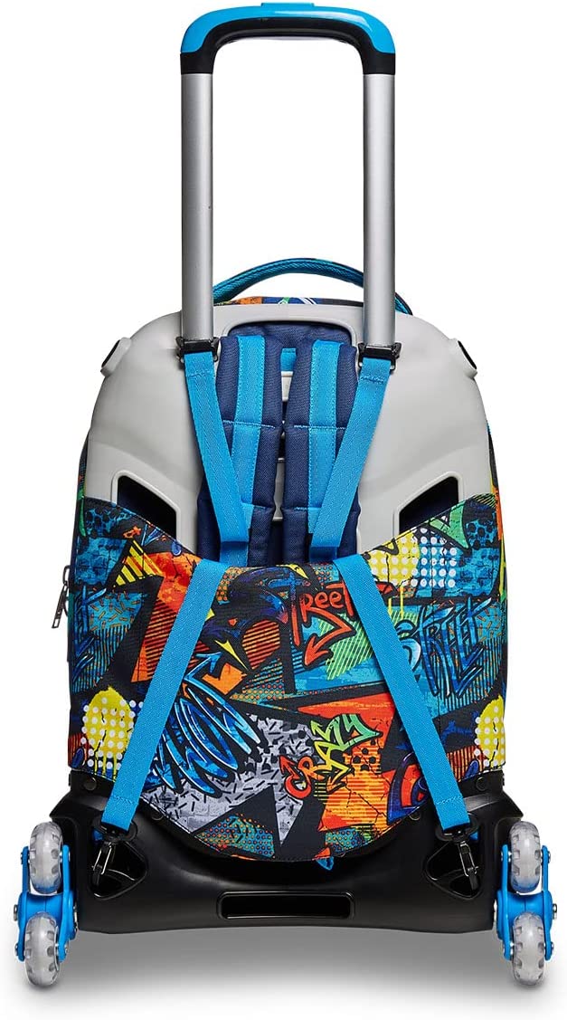 - In poche semplici mosse da trolley divento zaino e viceversa. Il mio carrello ha fondo rinforzato e protezioni angolari per dare stabilità al trolley e protezione al contenuto. Lo sganci e divento uno zaino lavabile, maxi capiente, dotato di tasca frontale e comodo da indossare grazie a schienale e spallacci imbottiti e rivestiti in tessuto. Spallacci che, se mi usi come trolley, possono essere a scomparsa sollevarsi automaticamente tirando su la resistente doppia barra telescopica.