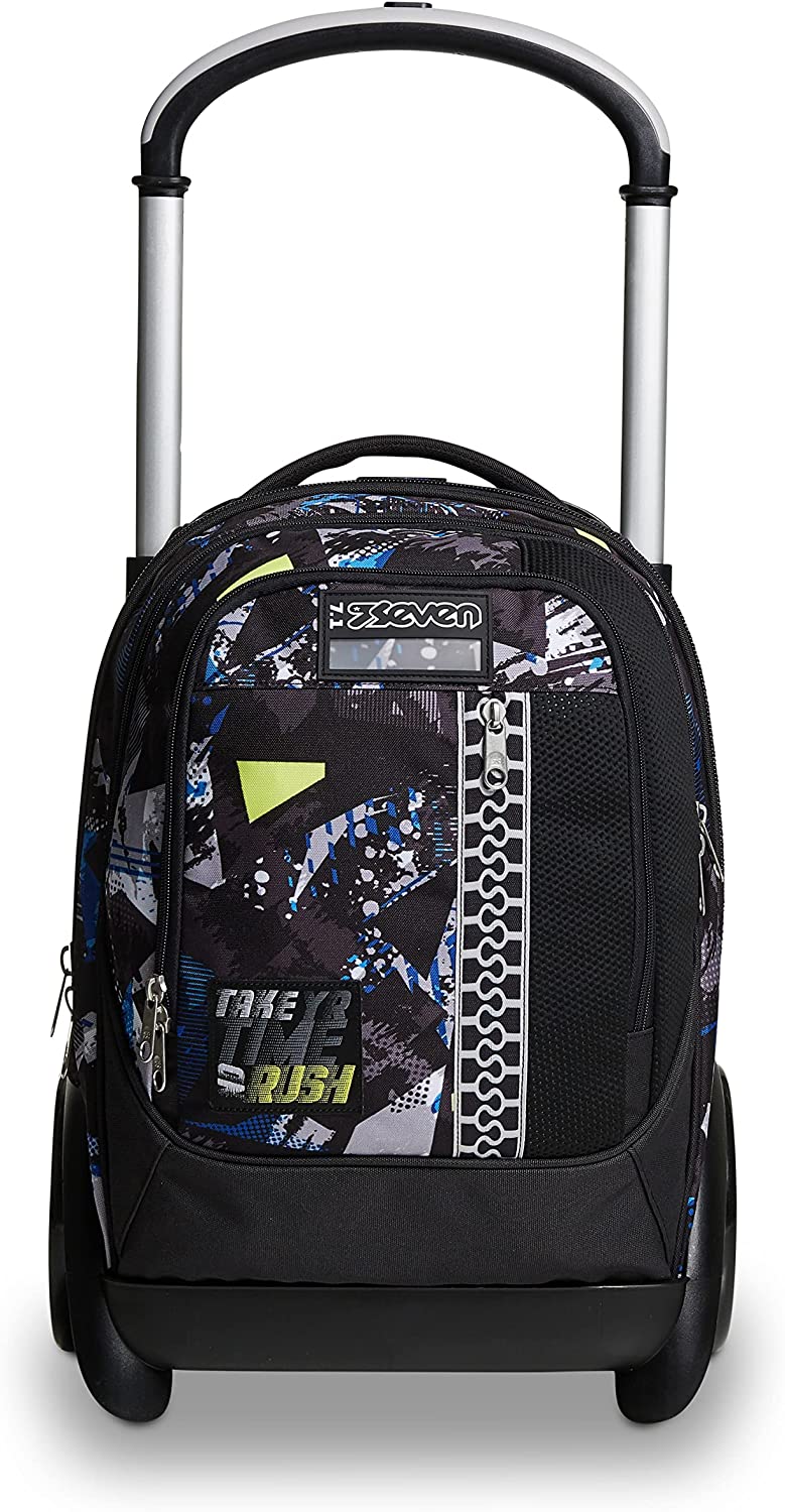 - Il Trolley Seven Tyre, dotato di maxi ruote da 17 cm, unisce stile e versatilità . Diventa zaino e viceversa. Il carrello ha fondo rinforzato e protezioni angolari. Lo sganci e diventa uno zaino maxi capiente, comodo da indossare grazie allo schienale preformato e agli spallacci imbottiti e traspiranti. Spallacci che possono essere a scomparsa o sollevarsi automaticamente tirando su la resistente doppia barra telescopica con doppia regolazione in altezza, evitando che i nastri striscino a terra.