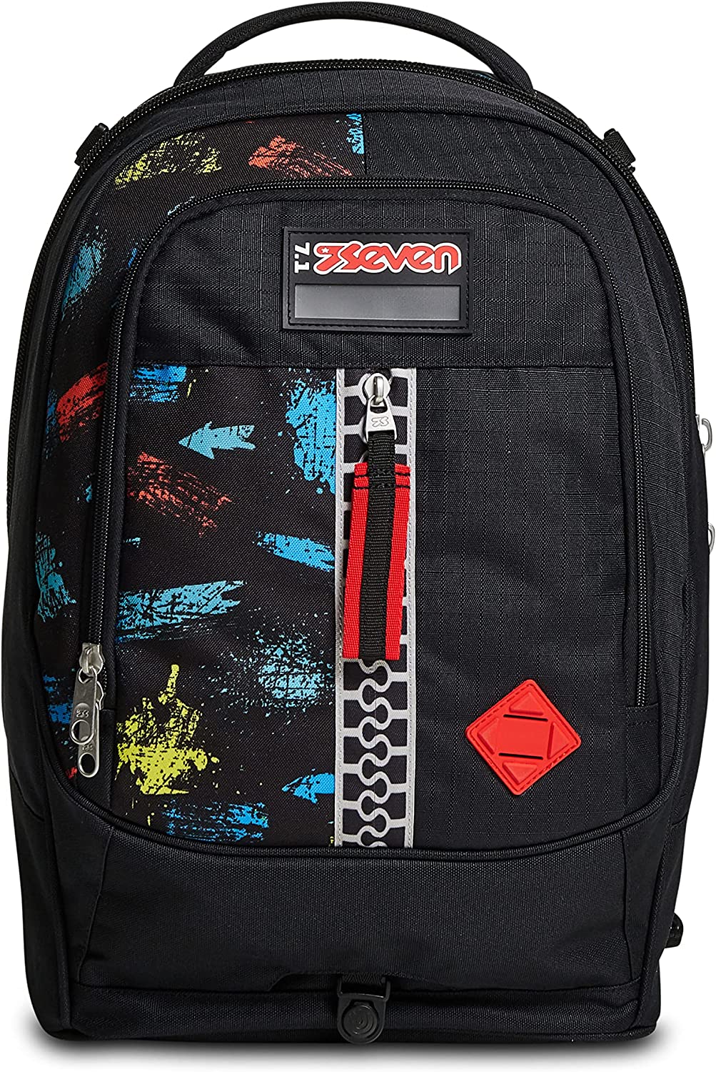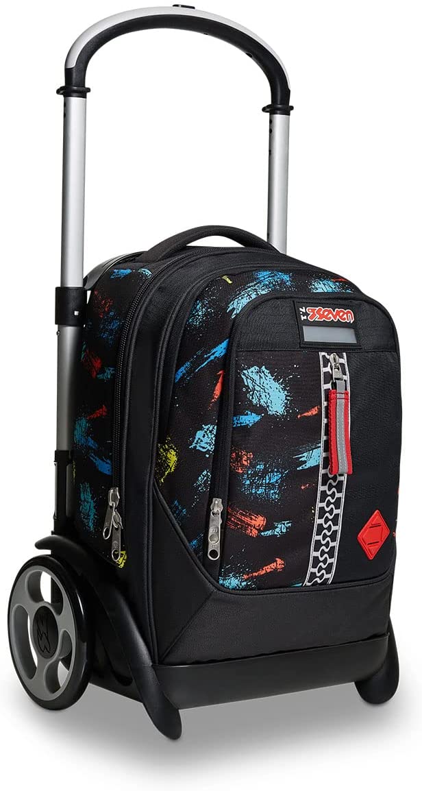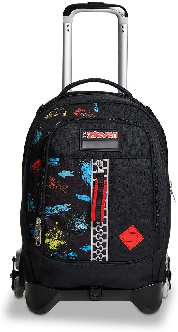 - Il Trolley Seven Tyre, dotato di maxi ruote da 17 cm, unisce stile e versatilità . Diventa zaino e viceversa. Il carrello ha fondo rinforzato e protezioni angolari. Lo sganci e diventa uno zaino maxi capiente, comodo da indossare grazie allo schienale preformato e agli spallacci imbottiti e traspiranti. Spallacci che possono essere a scomparsa o sollevarsi automaticamente tirando su la resistente doppia barra telescopica con doppia regolazione in altezza, evitando che i nastri striscino a terra.