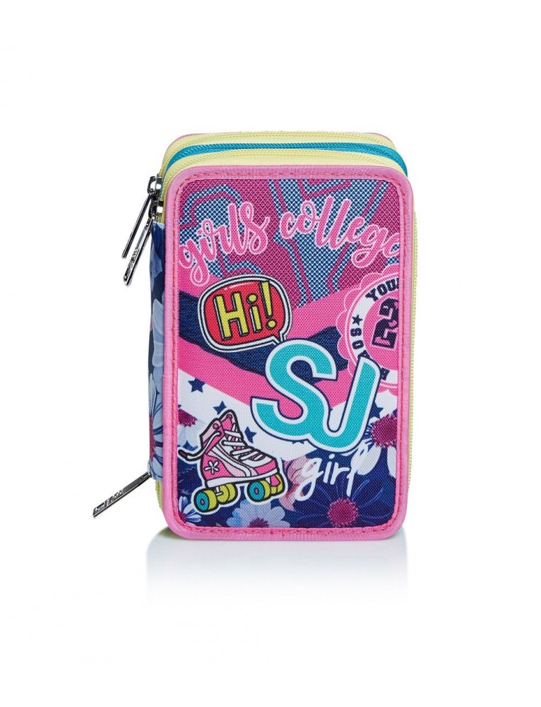 Ma ciauu!! Sono proprio il meraviglioso accessorio che devi essere sempre sicura di avere nello zaino! Perché? Perché nei miei tre scomparti ho davvero tutto il materiale che ti serve a scuola! Ovvio, soltanto materiale di prima qualità come la penna cancellabile Frixion, la penna a sfera Tratto1Uno Grip, i 18 pennarelli Giotto Turbocolor, i 18 pastelli a colori Giotto Supermina, la colla Pritt e tutto il resto! E poi sono coloratissimo e gioioso da abbinare con gli zaini e i trolley SJ GANG che preferisci Cosa aspetti a prendermi?