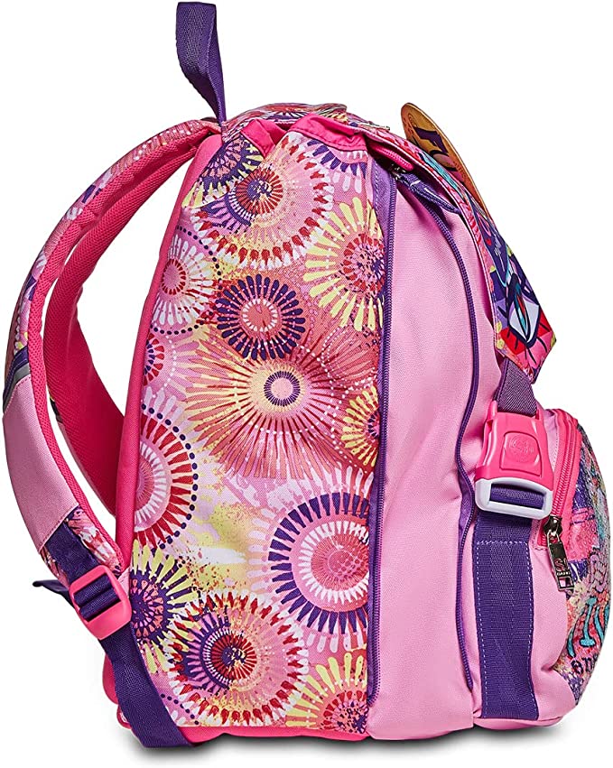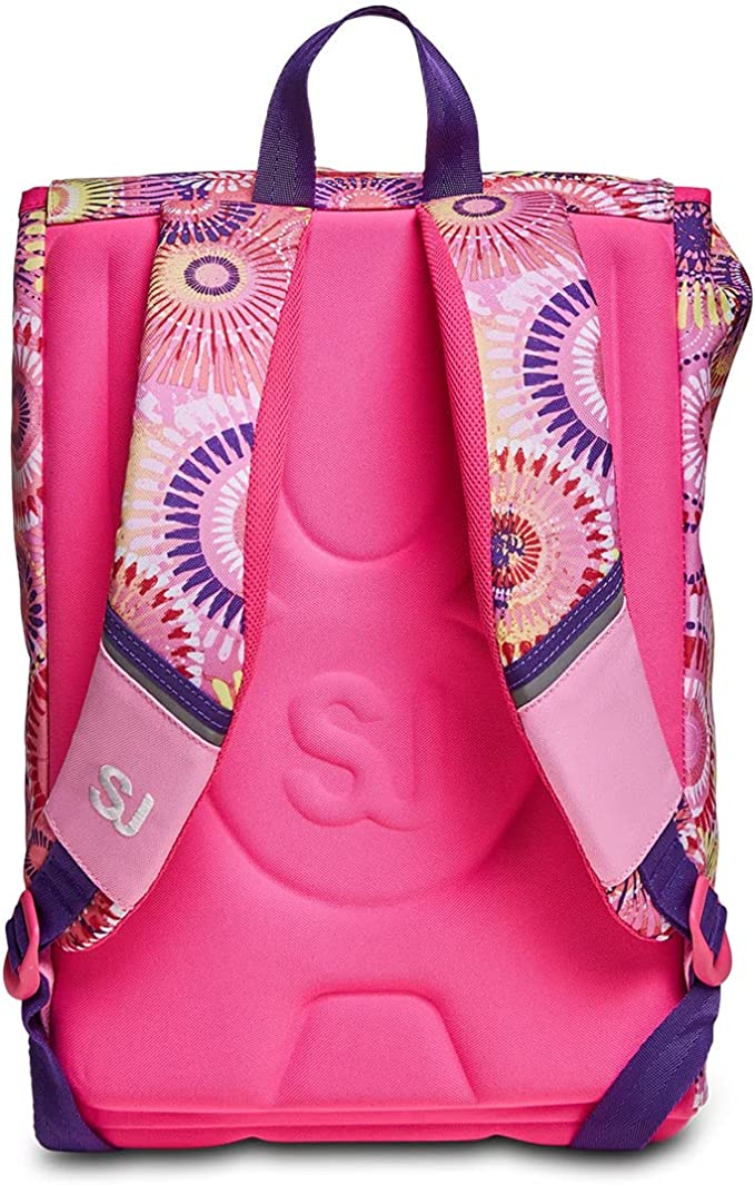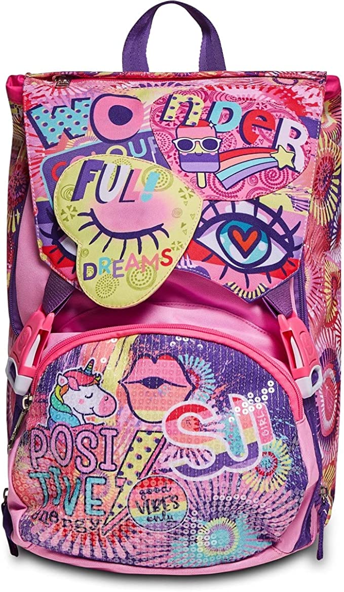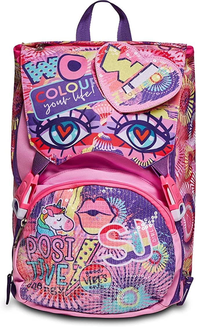 Ciao! Sono il nuovo zaino estensibile FACCE DA SJ GIRL! Grazie al mio FLIP SYSTEM, puoi divertirti a cambiarmi aspetto ogni volta che vuoi, sfogliando i mini flip con paillettes sulla pattina e creando combinazioni diverse! Ho un doppio scomparto spazioso, di cui puoi aumentare facilmente la capienza tramite le zip laterali per poter accogliere e distribuire in modo ottimale anche i carichi piĂ¹ pesanti, . Sono dotato di una tasca frontale, ma soprattutto sono davvero comodo da indossare sulle spalle, grazie allo schienale Ergosystem preformato e agli spallacci imbottiti e traspiranti. In piĂ¹, il fondo integrato mantiene la mia struttura inalterata, garantendo la stabilitĂ del contenuto anche a pieno carico.