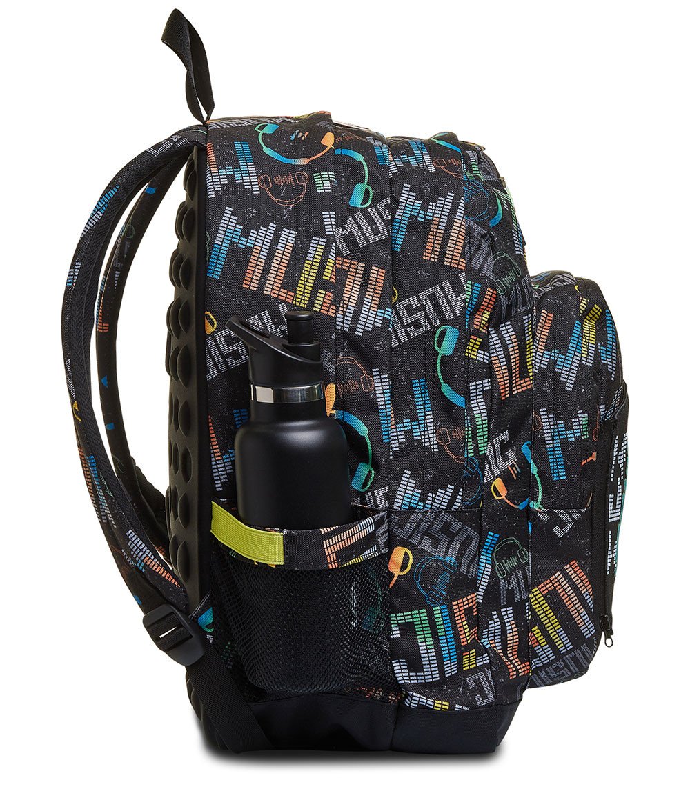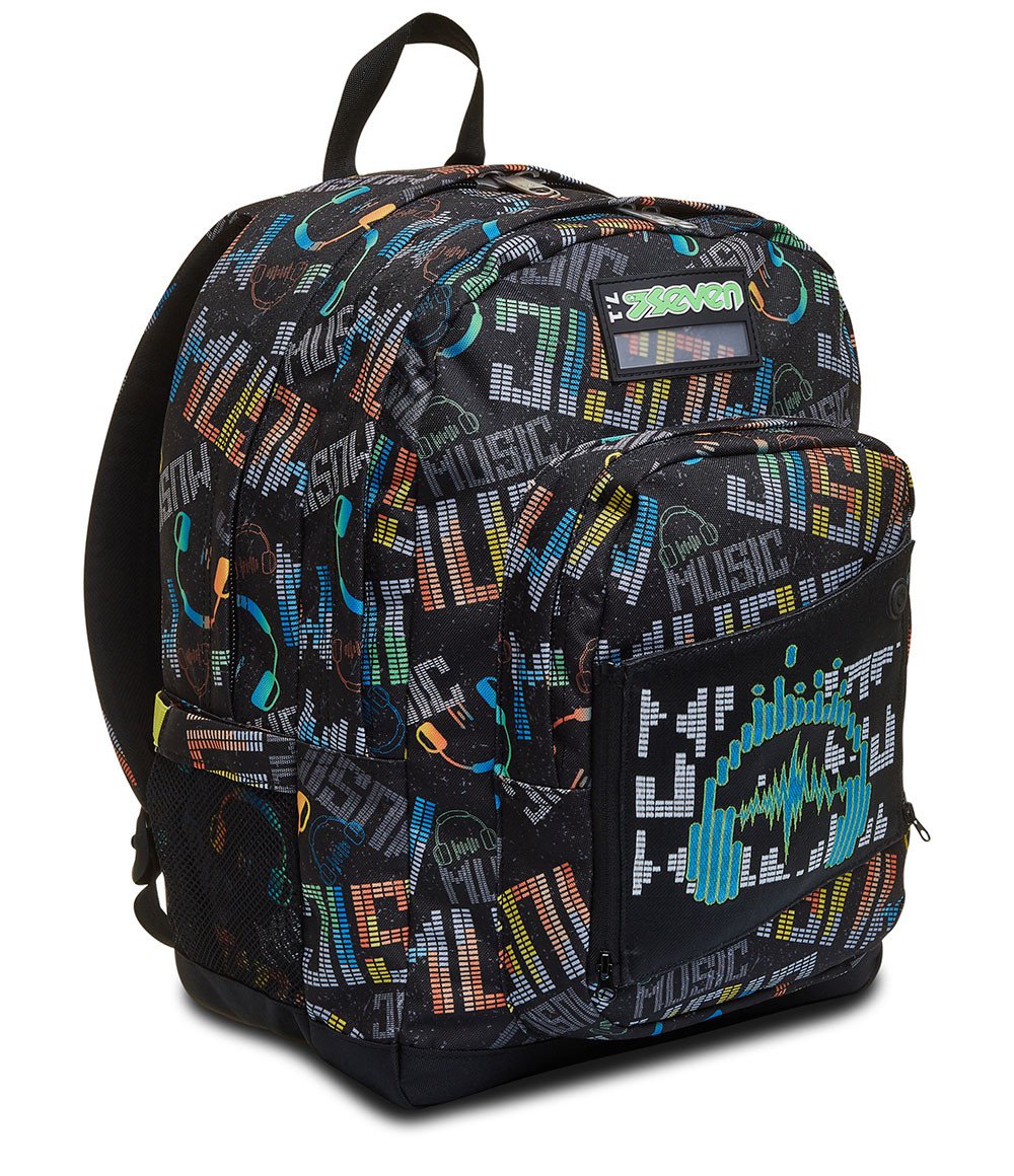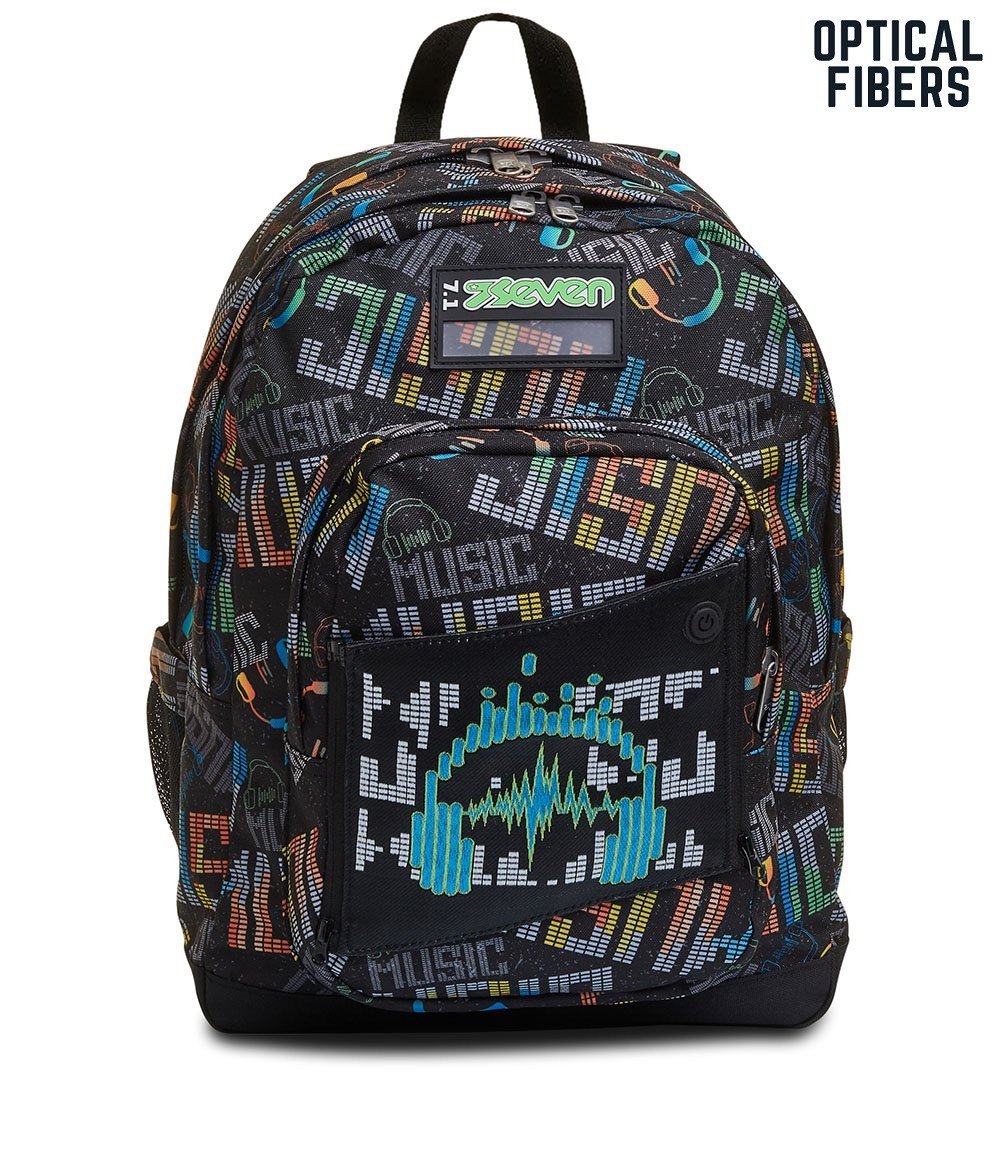 Lo zaino Seven Freethink MUSICBRIGHTING, curato nei minimi particolari, è dotato di una fantastica grafica con cuffie in fibre ottiche che puoi divertirti ad accendere ogni volta che vuoi tramite l’apposito pulsante. L’inserto su cui sono posizionate è removibile per permettere il lavaggio dello zaino, che è comodo da indossare sulle spalle grazie allo schienale Ergosystem preformato e agli spallacci imbottiti e traspiranti. E nel suo capiente e spazioso doppio scomparto puoi metterci davvero tutto quello che ti serve, anche il tuo notebook e la tua borraccia, potendo sfruttare anche le sue comode e pratiche tasche.