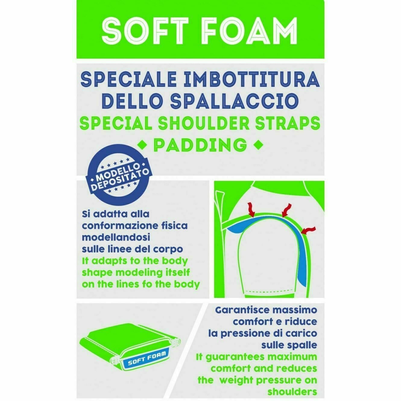 Gli spallacci sono stati completamente riprogettati e realizzati in Softy Foam, una speciale imbottitura che si modella sulle linee delle tue spalle e ne riduce la pressione di carico.