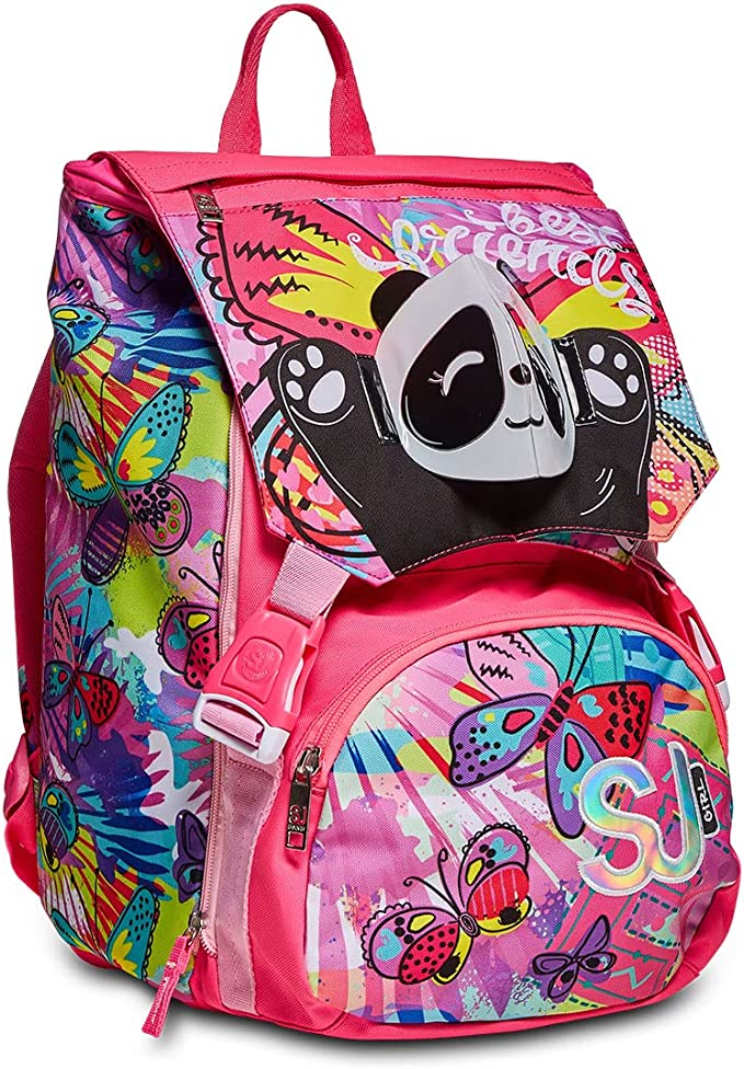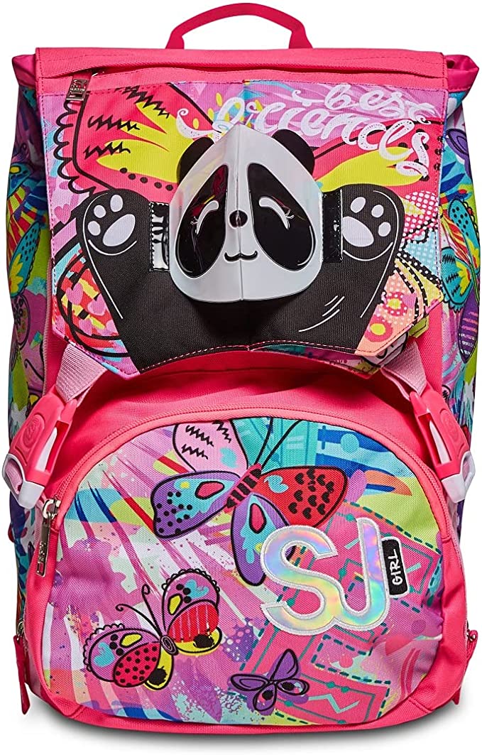 Ciao! Sono il nuovo zaino estensibile FLIP-3D DA SJ GIRL! Grazie al mio FLIP SYSTEM puoi divertirti a cambiarmi aspetto ogni volta che vuoi! E con la pattina in 3D vedrai spuntare un bellissimo panda dallo zaino! sfoglia le pattine e crea combinazioni diverse! Ho un doppio scomparto spazioso, di cui puoi aumentare facilmente la capienza tramite le zip laterali per poter accogliere e distribuire in modo ottimale anche i carichi piĂ¹ pesanti. Sono dotato di una tasca frontale, ma soprattutto sono davvero comodo da indossare sulle spalle, grazie allo schienale Ergosystem preformato e agli spallacci imbottiti e traspiranti. In piĂ¹, il fondo integrato mantiene la mia struttura inalterata, garantendo la stabilitĂ del contenuto anche a pieno carico.