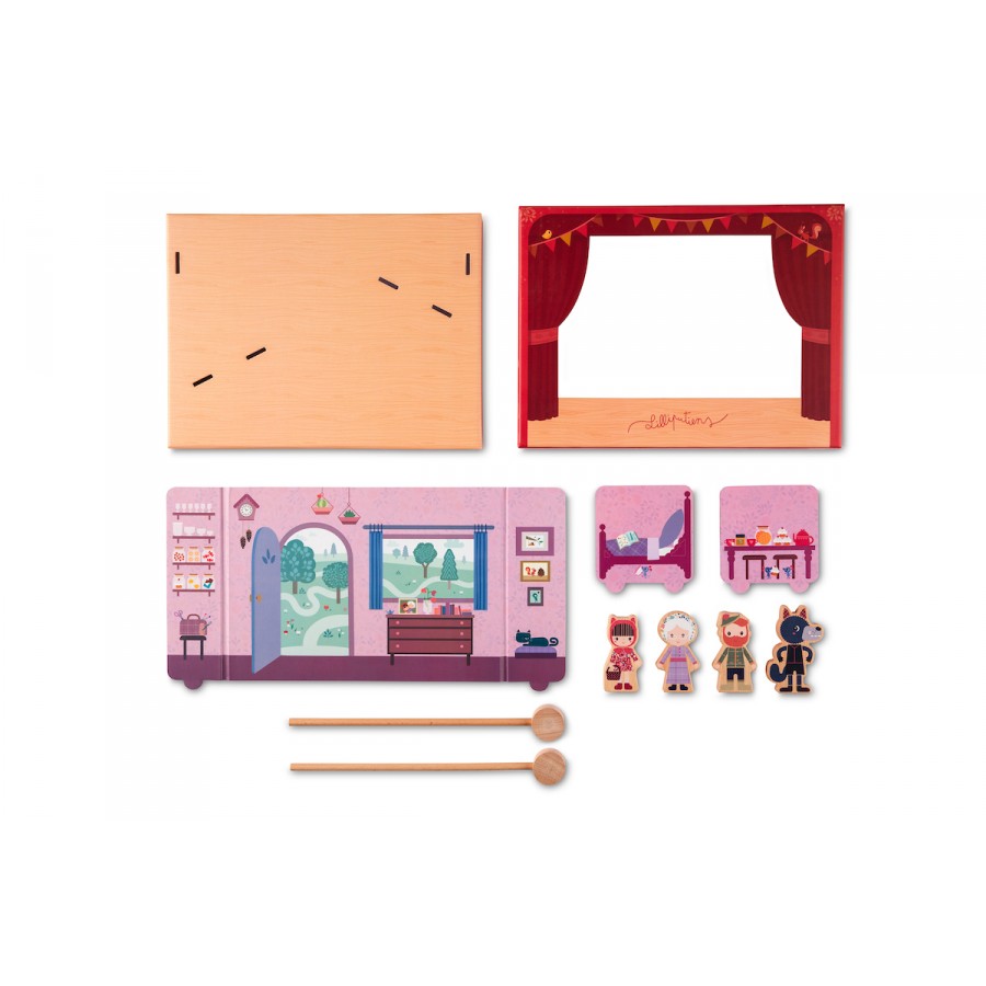 Con questo divertente teatro rappresenti la storia di Cappuccetto Rosso, o inventi la tua propria storia! I personaggi di legno si muovono sul palcoscenico fra gli sfondi magnificamente decorati, grazie a 2 bastoni di legno con una calamita. In un batter d’occhio la scatola si trasforma in un teatro. Gli sfondi si trovano sui due lati per creare diverse scene. I 4 personaggi di legno diventano vivi sul palcoscenico grazie al bastoncini magnetizzati di legno. Cappuccetto Rosso, la nonna, il lupo e il cacciatore.