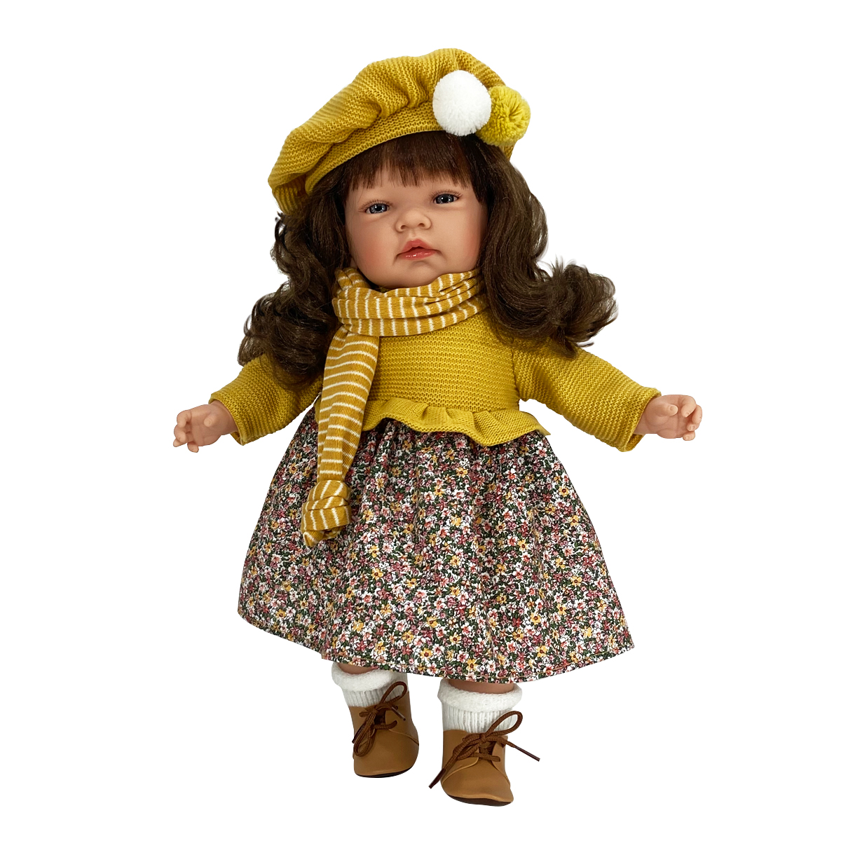 Celia Paris è una tenera bambola con un'espressione sognante e lunghi capelli castani. Ha un vestitino con maglia sui toni del giallo senape e gonna a fiorellini. Una bellissima sciarpina a righe e il basco parisienne. Scarpine in ecopelle e calzine bianche.