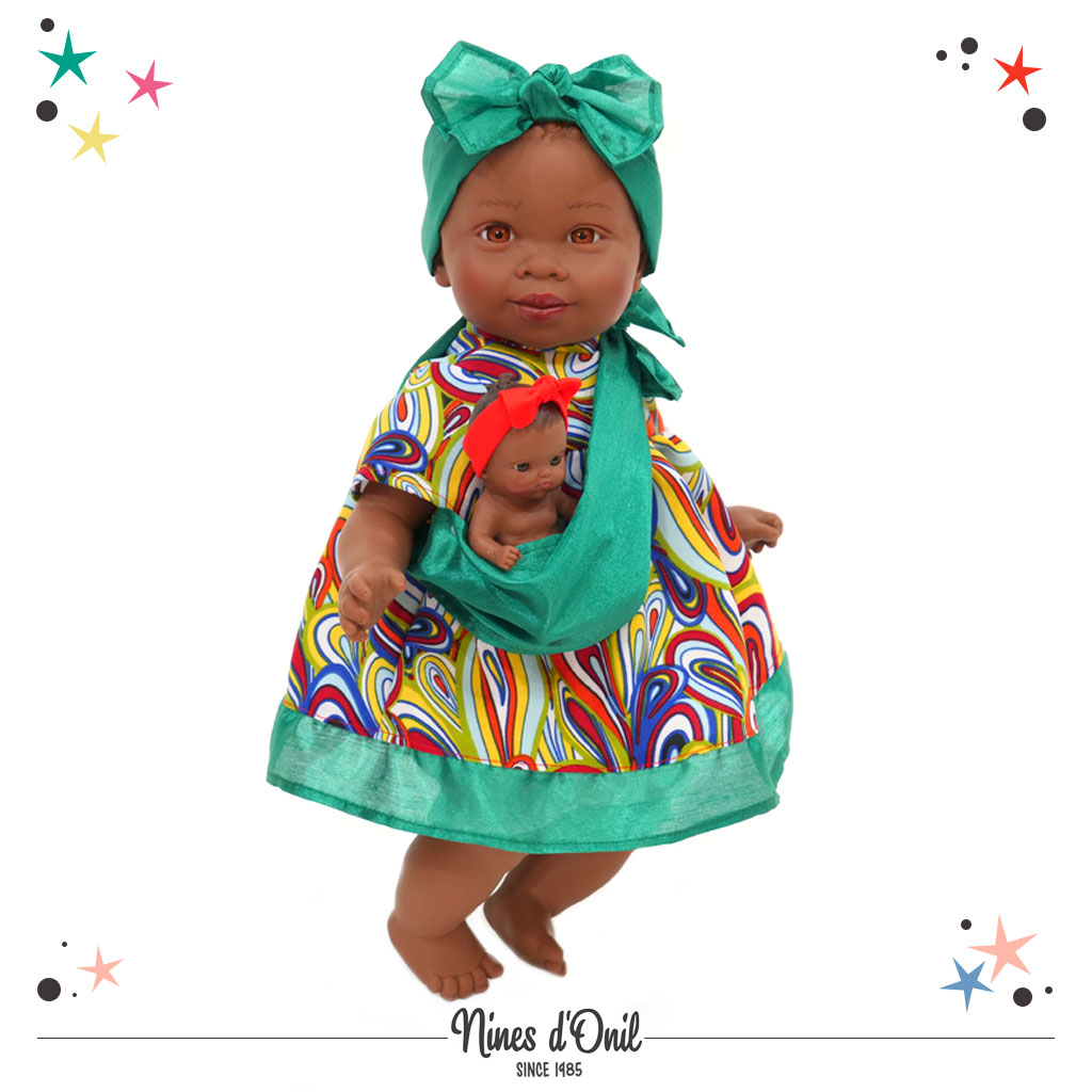 BAMBOLA CON BEBE IN FASCIA VESTITA CON UN TRADIZIONALE VESTITO AFRICANO.