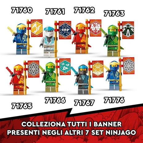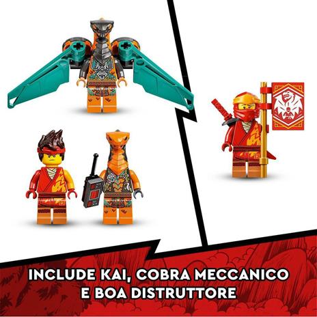 Questo set NINJAGO contiene 3 minifigure: Kai armato di una spada e 2 guerrieri serpente NINJAGO: il Boa Distruttore che controlla un drone sparatutto e il Cobra Meccanico con un jetpack e una pistola che spara una catena. Novità di gennaio 2022: quando i bambini sconfiggono i nemici ninja e completano la loro missione verranno premiati con un banner da collezionare.
