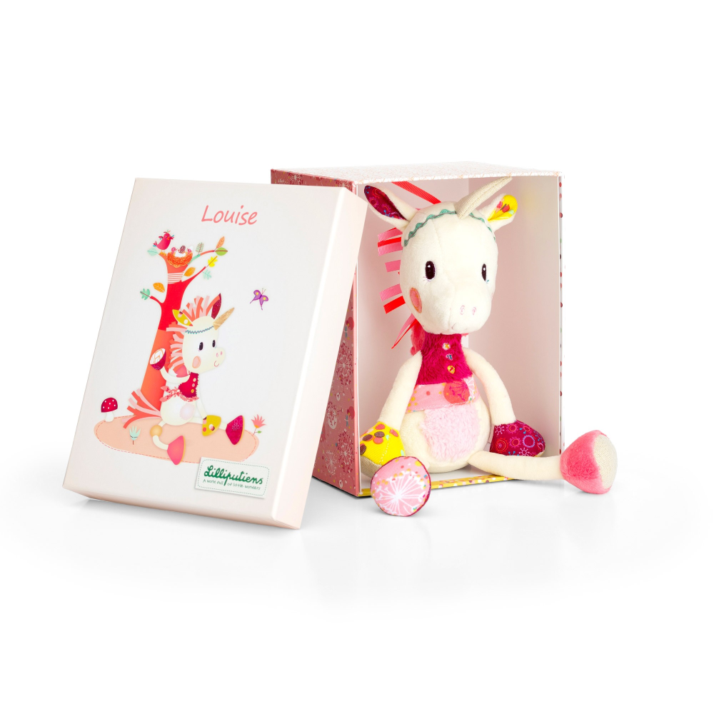Per un regalo originale e di alta qualità Lilliputiens ha creato una linea molto spiritosa e sempre molto utile per la crescita dei vostri piccoli bambini. Louise il tenero unicorno sarà molto onorata di essere un’ inseparabile amichetta dei vostri figli, infatti grazie al suo corpo morbido e facile da afferrare può essere abbracciata e portata ovunque. I suoi colori sono un ottimo strumento per lo sviluppo della retina e non avendo parti che si possono staccare è una sicurezza per accompagnare i cuccioli durante tutte le fasi della giornata ed anche della notte. L’elegante scatola di cui è dotata rende questo dolcissimo unicorno un regalo raffinato ed anche un ottimo tocco di eleganza nell’arredamento di una cameretta.