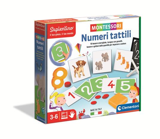 Contiene 10 tessere delle cifre smerigliate, ovvero con una speciale finitura ruvida da toccare per memorizzarne la forma.