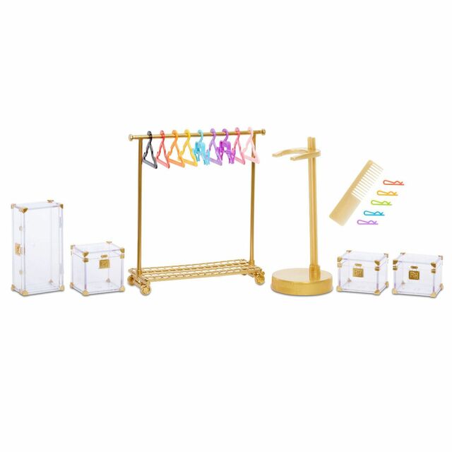 Step into the Rainbow High Fashion Studio, where Avery Styles is ready to find you the perfect look. Create 300+ looks with a rainbow of fashions you can mix and match. The Rainbow High Fashion studio comes with exclusive doll, Avery Styles. She's the glam fashion designer that everyone looks up to at school, and she's fully articulated, so she can strike so many glamorous poses. And if you're lucky enough to get an invite into her Fashion Studio, you'll find the perfect look for runway class. Also includes 2 sparkly, interchangeable wigs – one glittering rainbow wig and one luxe, hot pink wig. Change up Avery's look by changing her wigs, or style her without a wig, because she's got a cute pixie cut underneath. She comes with a full rack of rainbow fashions (doll clothes and doll accessories). Enjoy endless fashion play with the gorgeous gold fashion rack, high-end, clear shoe cases, hangers for fashions and a rainbow of hairpins for hair styling. Rainbow High Fashion Studio exclusive fashion doll, 2 interchangeable wigs, 5 tops, 2 skirts, 2 dresses, 1 jacket, 1 hoodie, 1 pair of jeans, 4 pairs of shoes, 9 hangers, 5 hairpins, 4 shoe boxes, 1 comb, 1 doll stand and 1 clothing rack. Collect the Rainbow! Collect all the gorgeous Rainbow High fashion dolls to complete the rainbow.