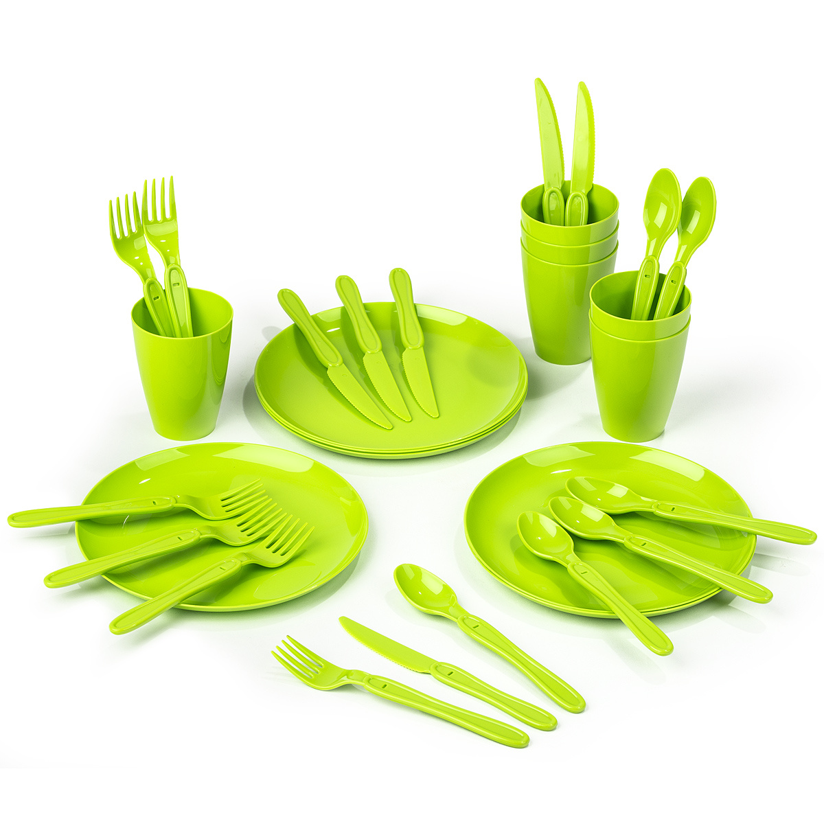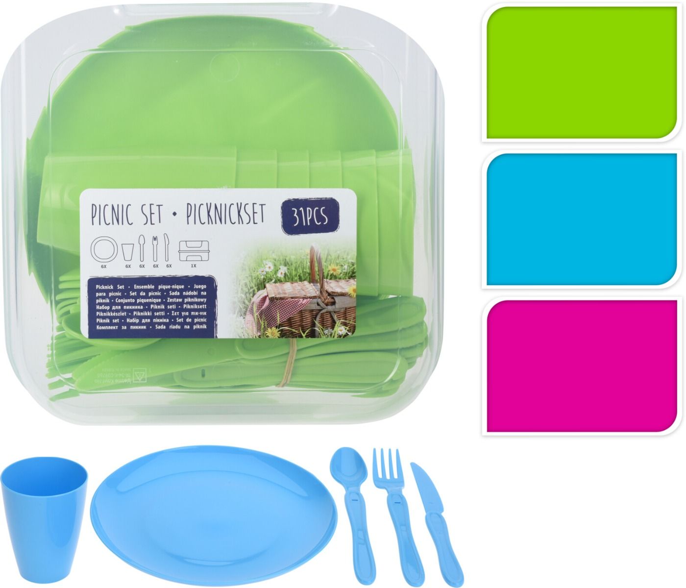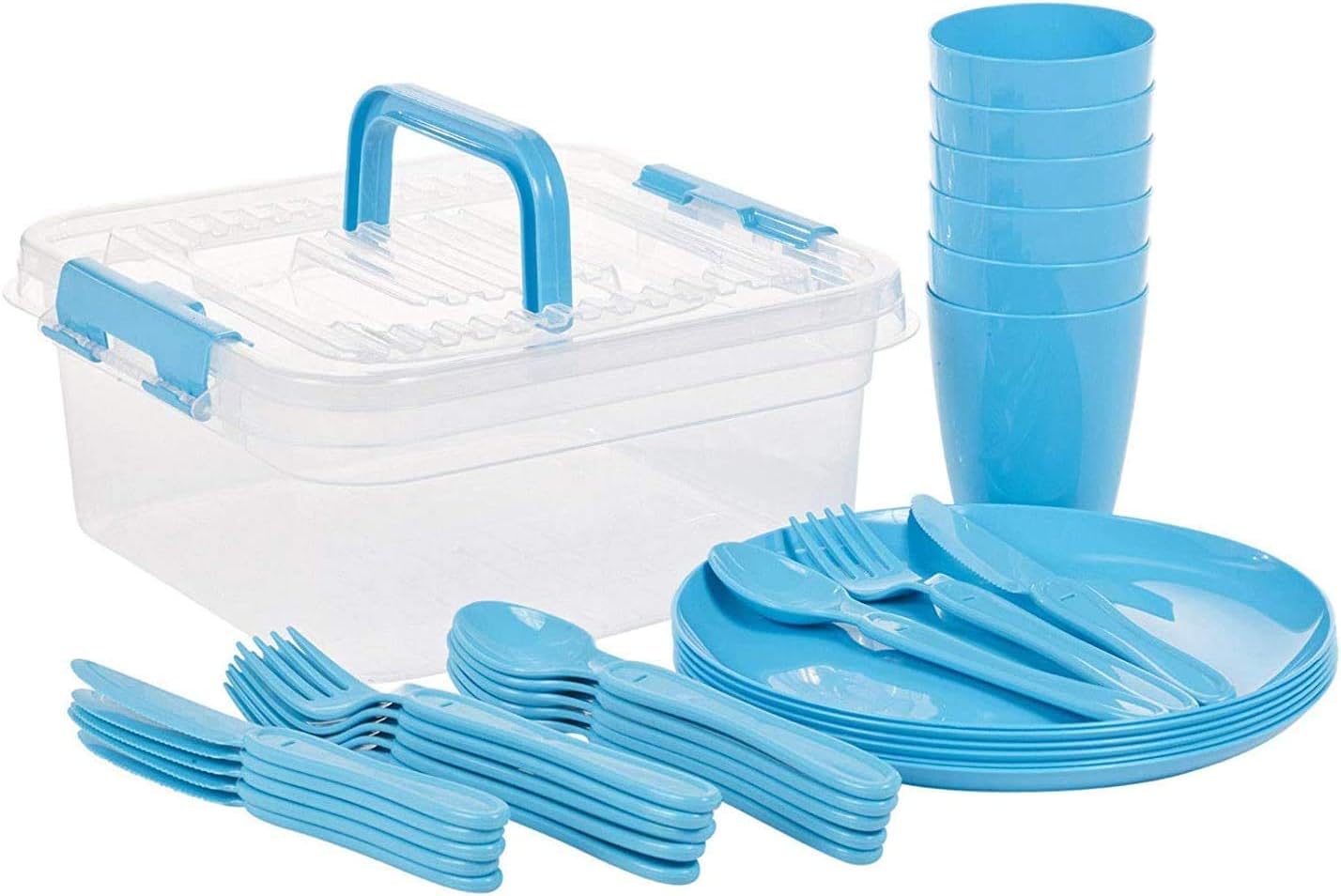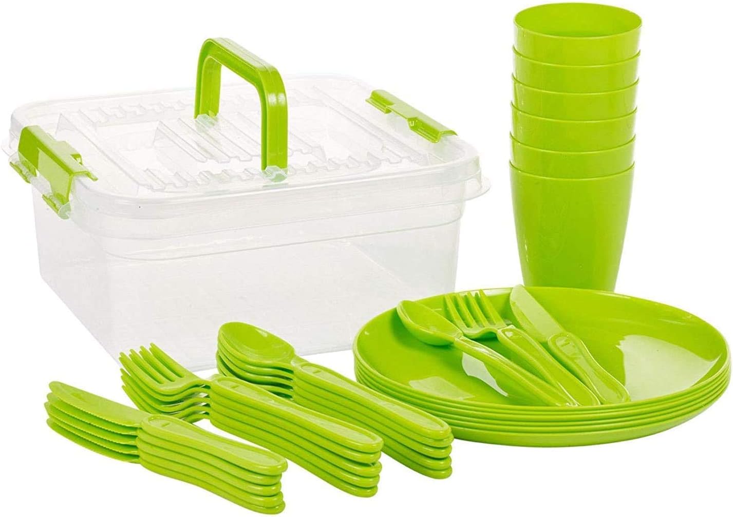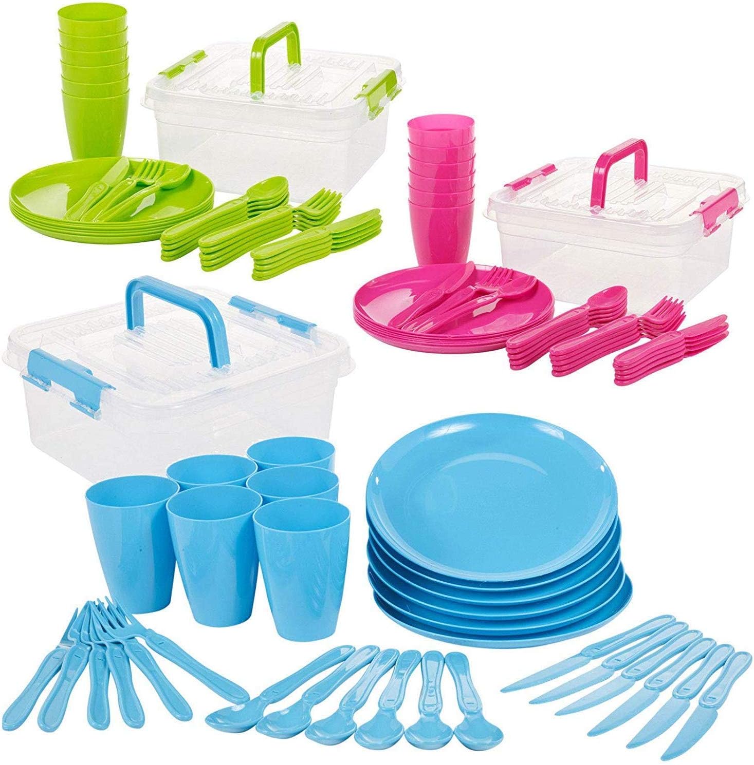 Grande set da picnic da 31 pezzi con custodia, ideale per uso interno o esterno. Ideale per picnic, campeggio e gite all'aperto, questo set da campeggio da 31 pezzi viene fornito con tutto il necessario per servire deliziosi pasti in movimento. Inoltre, il set viene fornito con un pratico contenitore per riporlo e trasportarlo facilmente. Facile da pulire, riutilizzabile e durevole. Contenuto: 6 piatti, 6 tazze, 6 forchette, 6 coltelli, 6 cucchiai, contenitore. Colori assortiti: verde, blu e rosa.